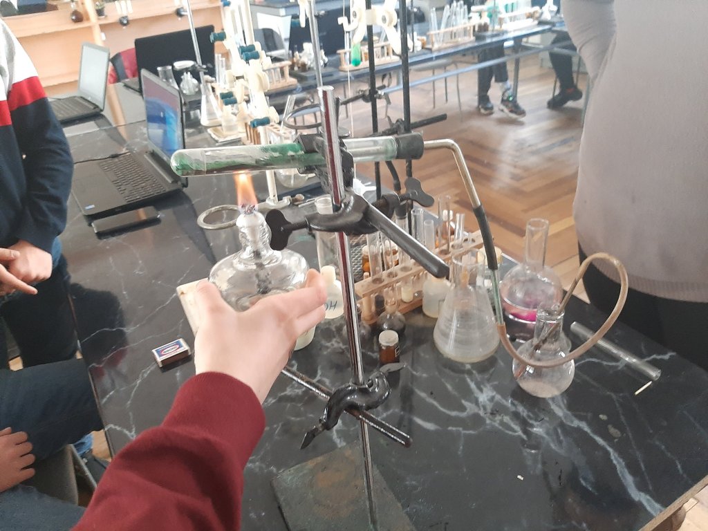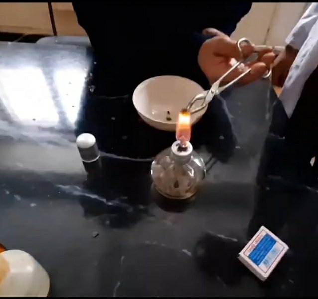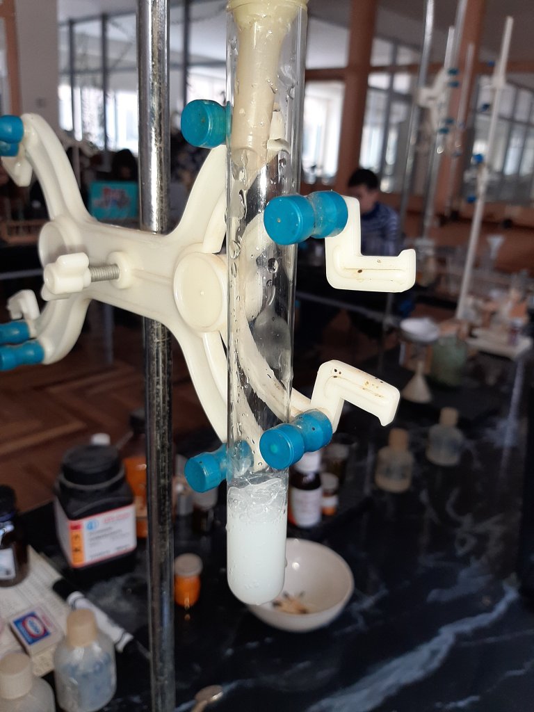 Փորձանոթի մեջ լցրեցինք կանաչ գույնի մալաքիտի փոշի, ամրացրեցինք հորիզոնական դիրքով կալանի թաթին, փակեցինք խցանով, որի մեջ կար գազատար խողովակ, որը իջեցրինք ջրով լի կոլբայի մեջ։Նկատեցինք, որ կանաց գույնի մալաքիտը սևացավ, պատերի առաջանաց ջրի կաթիլներ։
