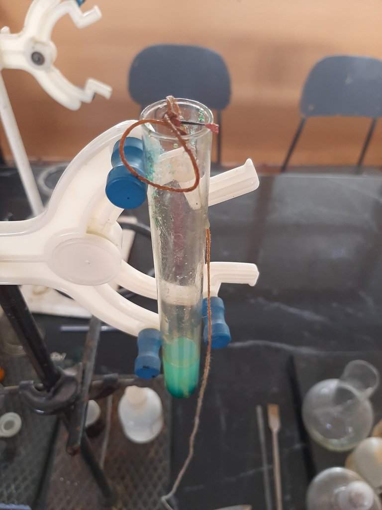 Փորձանոթը ամրացրինք կալանի թաթին, լցրեցինք ջուր 2-3 մլ, և վերցրեցինք կապույտ քլորիդը, և խարնեցինք և իջացրեցինք թելով մեխը։ Միաժամանակ հետո մեխը կարմրեց, որովհետև պղինձը անջատվեց և լուծույթը թոխեց իր գունյնը։